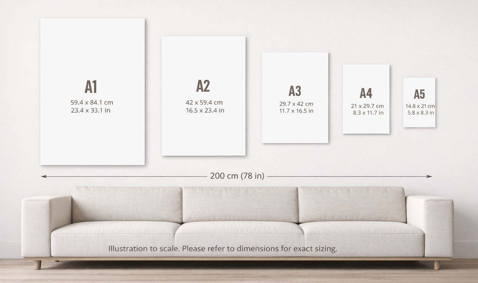 A-ratio prints can be framed to size for a clean, full-bleed look (A4 in an A4 frame etc.). For a more traditional gallery presentation, we recommend framing one size up with a mat — for example, an A3 print in an A2 frame.