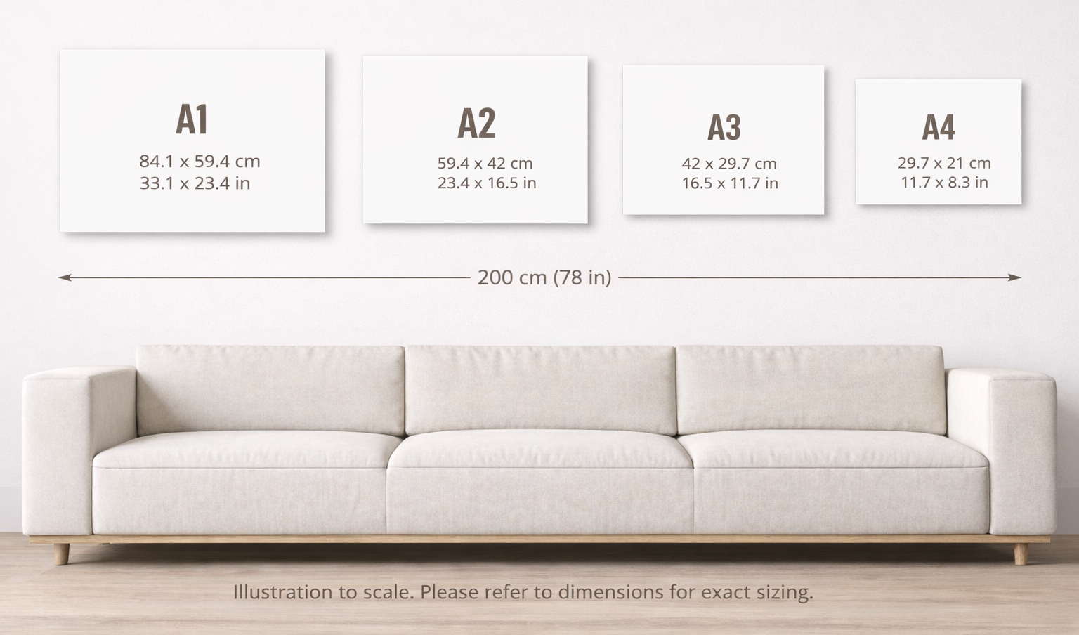 A-ratio prints can be framed to size for a clean, full-bleed look (A4 in an A4 frame etc.). For a more traditional gallery presentation, we recommend framing one size up with a mat — for example, an A3 print in an A2 frame.
